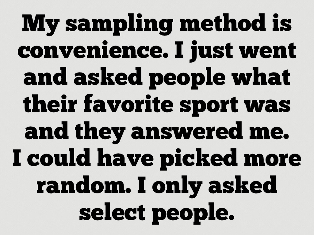 My sampling method is convenience. I just went and asked people what their favorite sport was and they answered me.
