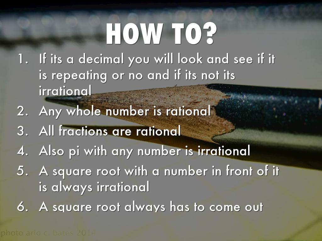 If its a decimal you will look and see if it is repeating or no and if its not its irrational