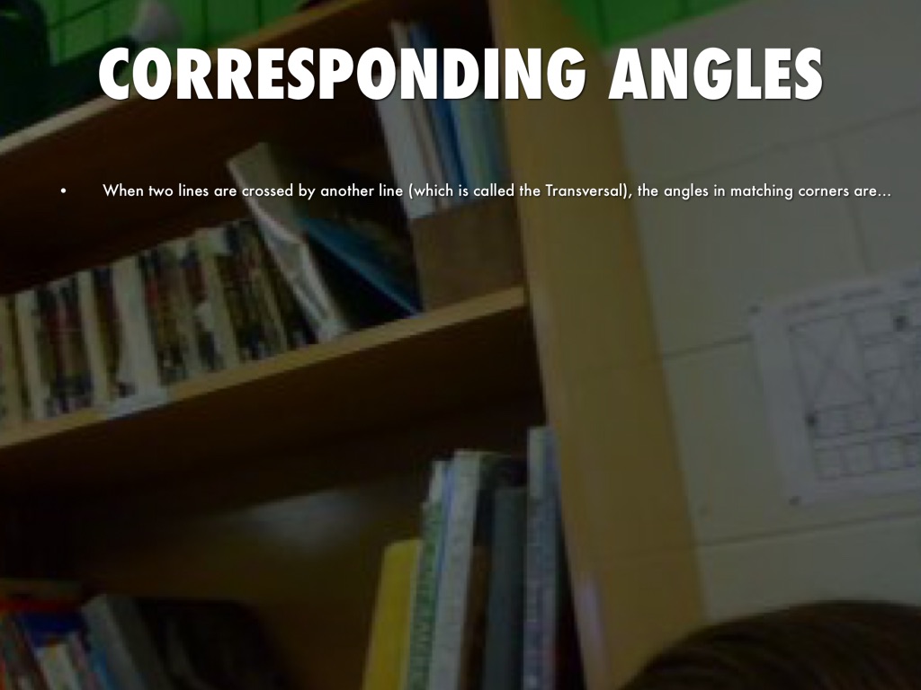 When two lines are crossed by another line (which is called the Transversal), the angles in matching corners are called corresponding angles.