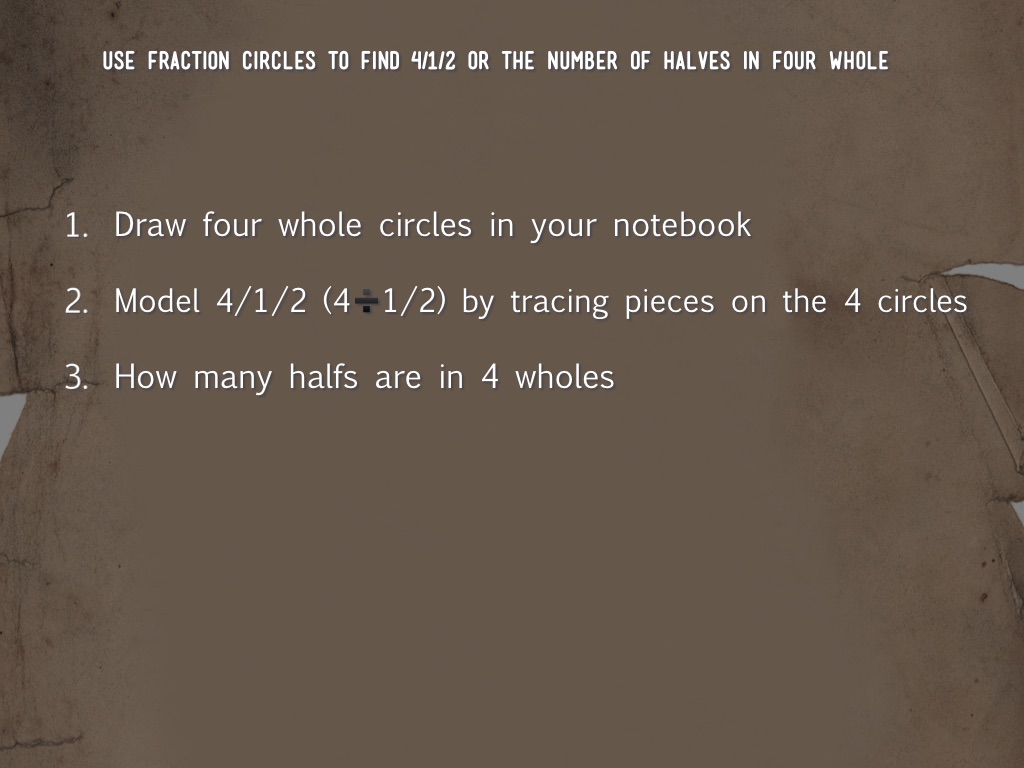USE FRACTION CIRCLES TO FIND 4/1/2 OR THE NUMBER OF HALVES IN FOUR WHOLE