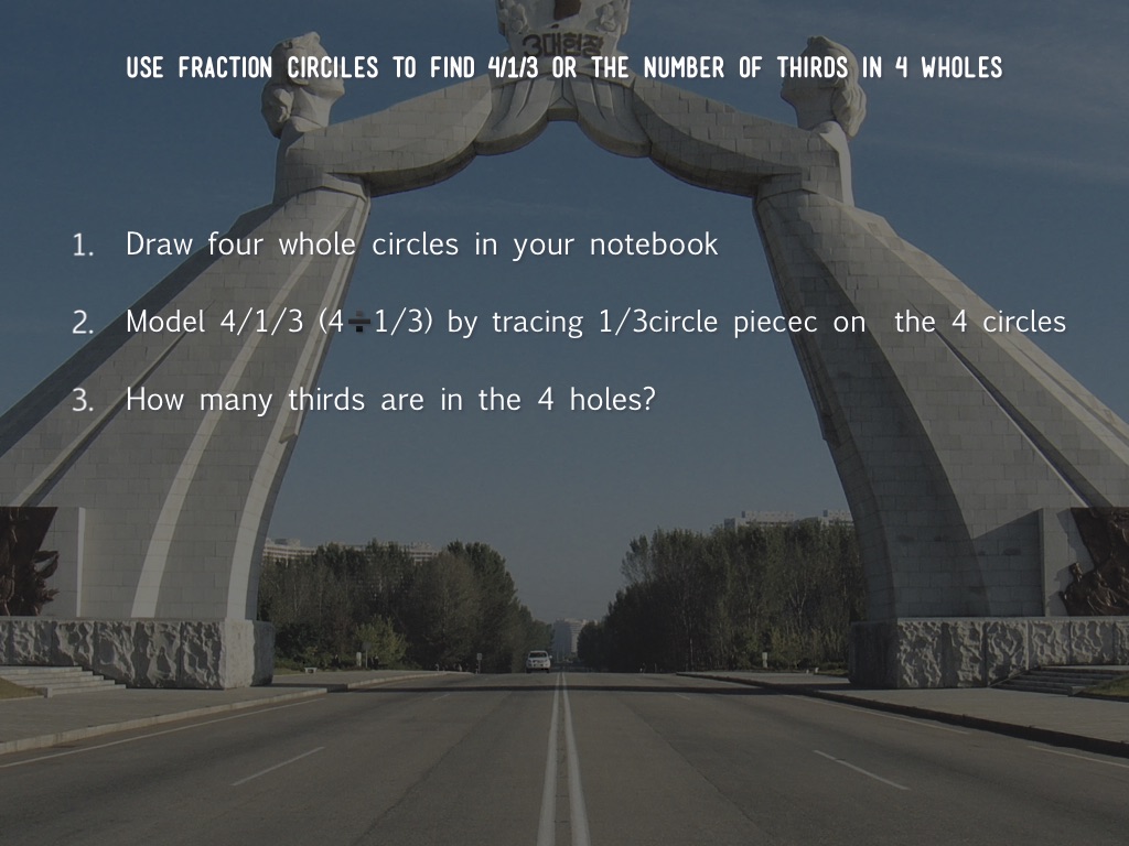 USE FRACTION CIRCILES TO FIND 4/1/3 OR THE NUMBER OF THIRDS IN 4 WHOLES
