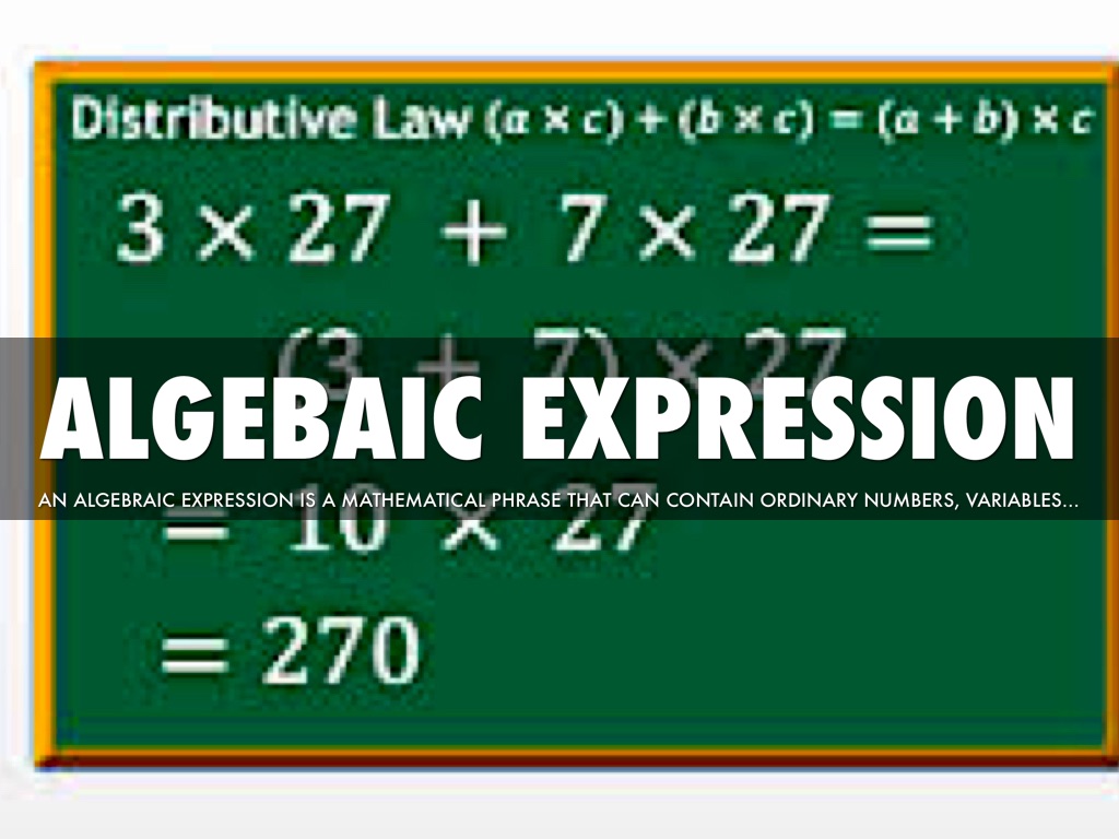AN ALGEBRAIC EXPRESSION IS A MATHEMATICAL PHRASE THAT CAN CONTAIN ORDINARY NUMBERS, VARIABLES (LIKE X OR Y) AND OPERATORS (LIKE ADD,SUBTRACT,MULTIPLY, AND DIVIDE). HERE ARE SOME ALGEBRAIC EXPRESSIONS: A + 1 A - B 3X X - A / B.