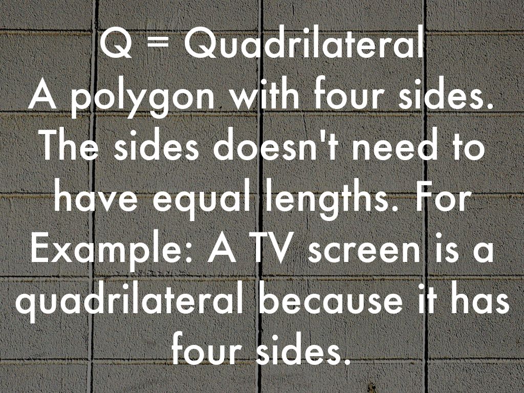 A polygon with four sides. The sides doesn't need to have equal lengths. For Example: A TV screen is a quadrilateral because it has four sides.
