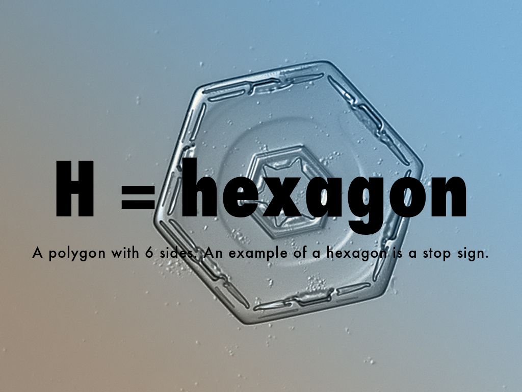 A polygon with 6 sides. An example of a hexagon is a stop sign.