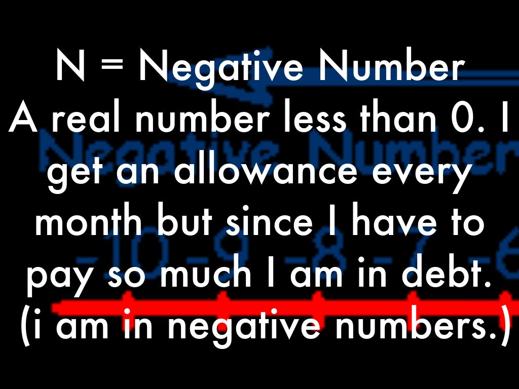 A real number less than 0. I get an allowance every month but since I have to pay so much I am in debt. (i am in negative numbers.)