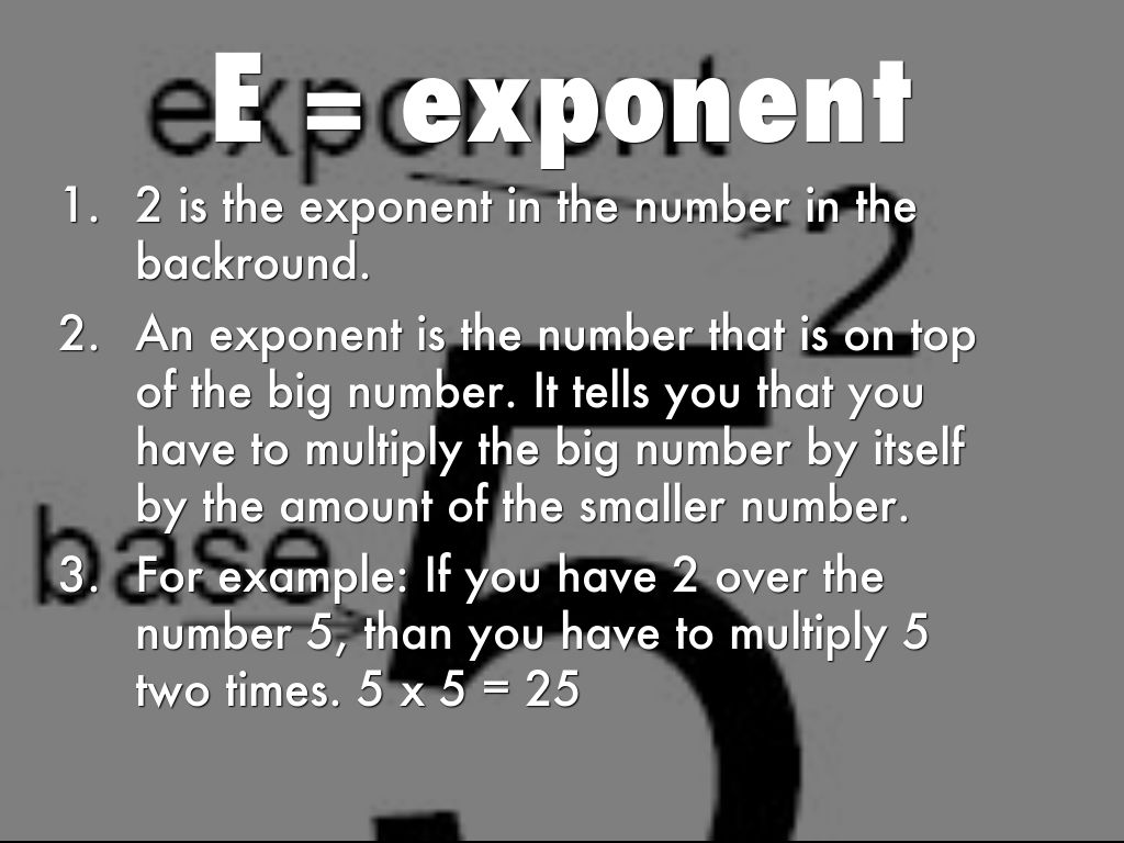 • An exponent is the number that is on top of the big number. It tells you that you have to multiply the big number by itself by the amount of the smaller number.