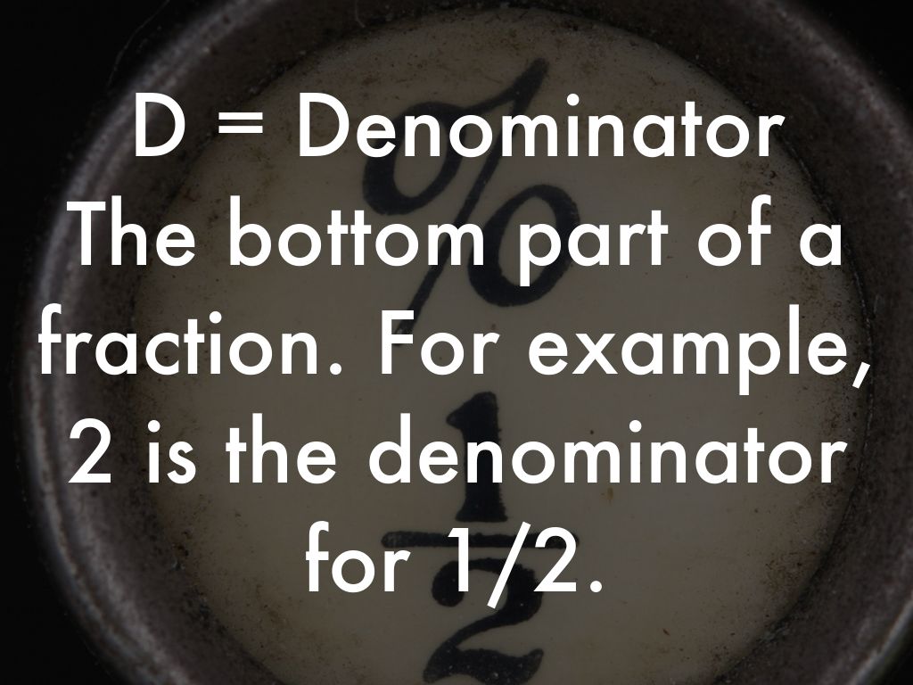 The bottom part of a fraction. For example, 2 is the denominator for 1/2.
