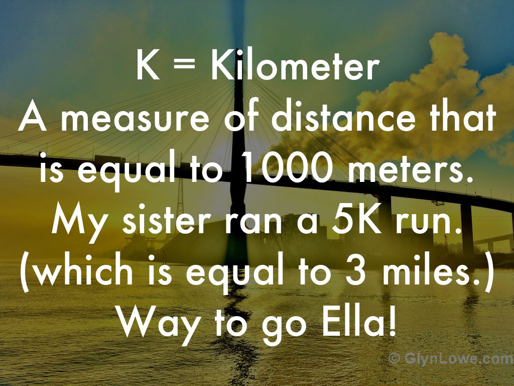 A measure of distance that is equal to 1000 meters. My sister ran a 5K run. (which is equal to 3 miles.) Way to go Ella!