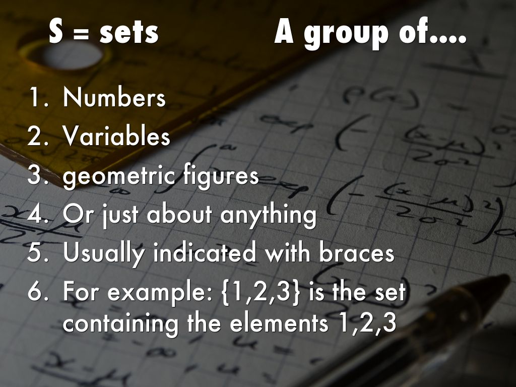 • For example: {1,2,3} is the set containing the elements 1,2,3