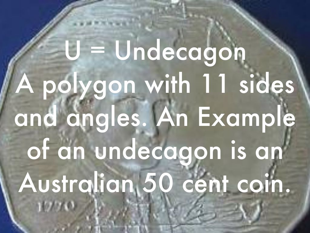 A polygon with 11 sides and angles. An Example of an undecagon is an Australian 50 cent coin.