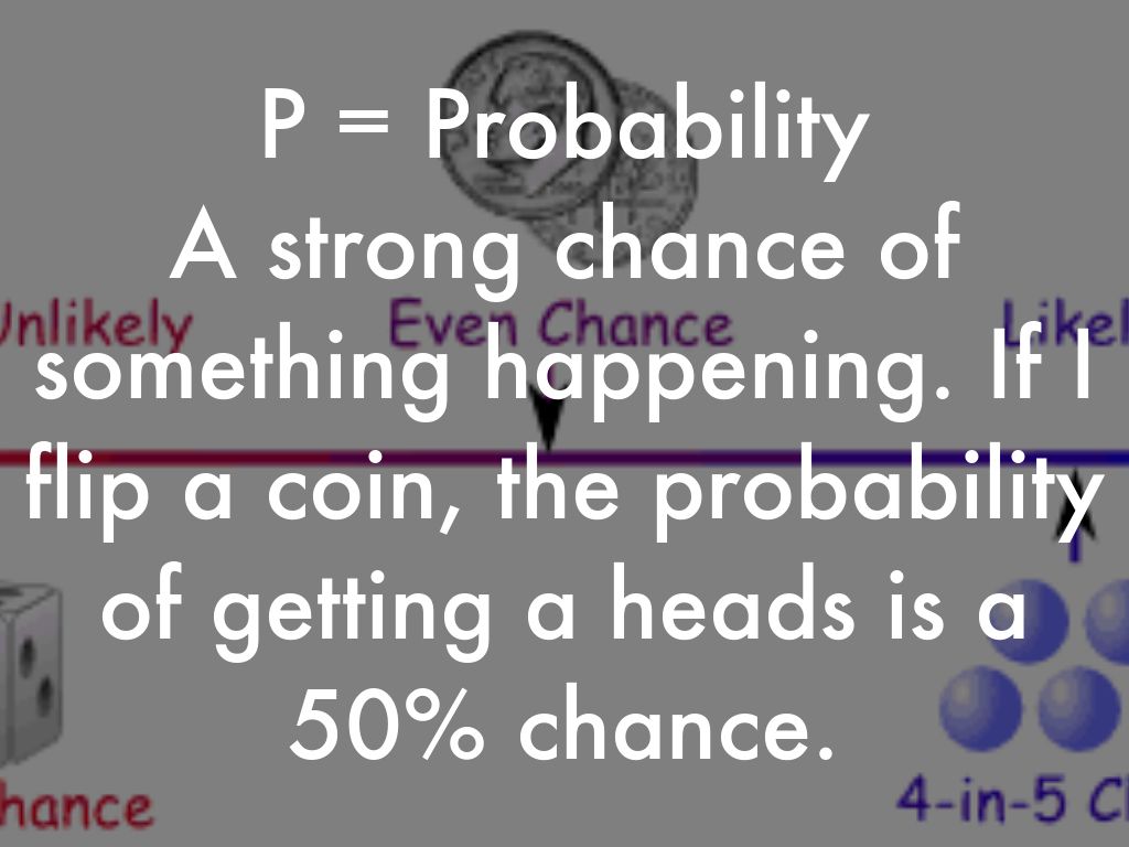 A strong chance of something happening. If I flip a coin, the probability of getting a heads is a 50% chance.