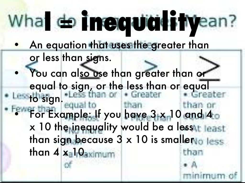 • For Example: If you have 3 x 10 and 4 x 10 the inequality would be a less than sign because 3 x 10 is smaller than 4 x 10.