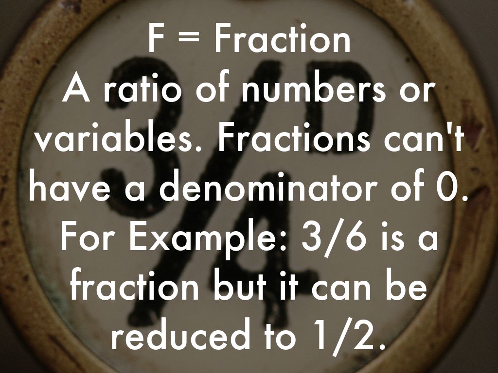 A ratio of numbers or variables. Fractions can't have a denominator of 0. For Example: 3/6 is a fraction but it can be reduced to 1/2.