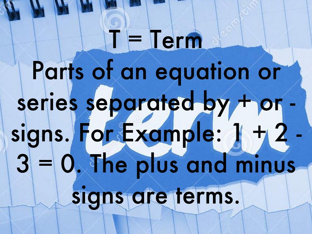 Parts of an equation or series separated by + or - signs. For Example: 1 + 2 - 3 = 0. The plus and minus signs are terms.