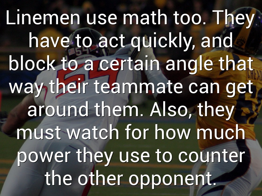 Linemen use math too. They have to act quickly, and block to a certain angle that way their teammate can get around them. Also, they must watch for how much power they use to counter the other opponent.