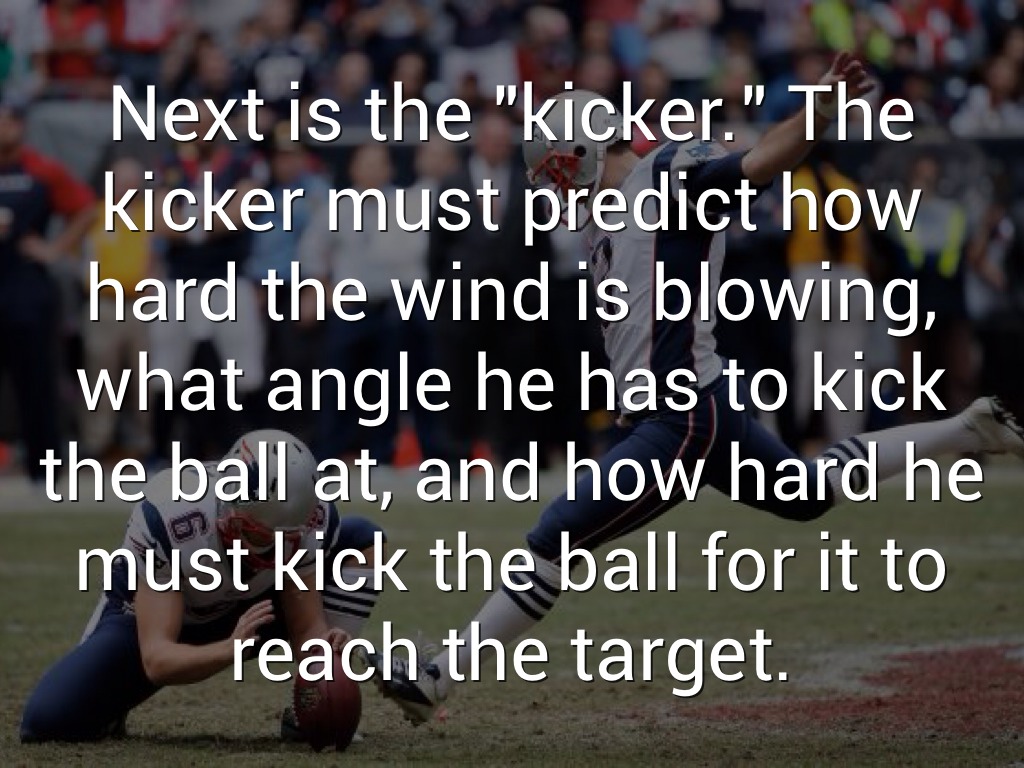 Next is the "kicker." The kicker must predict how hard the wind is blowing, what angle he has to kick the ball at, and how hard he must kick the ball for it to reach the target.
