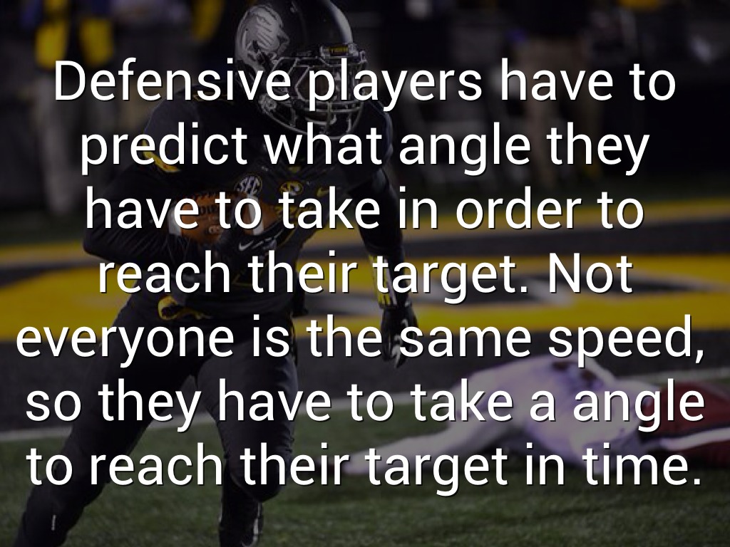 Defensive players have to predict what angle they have to take in order to reach their target. Not everyone is the same speed, so they have to take a angle to reach their target in time.