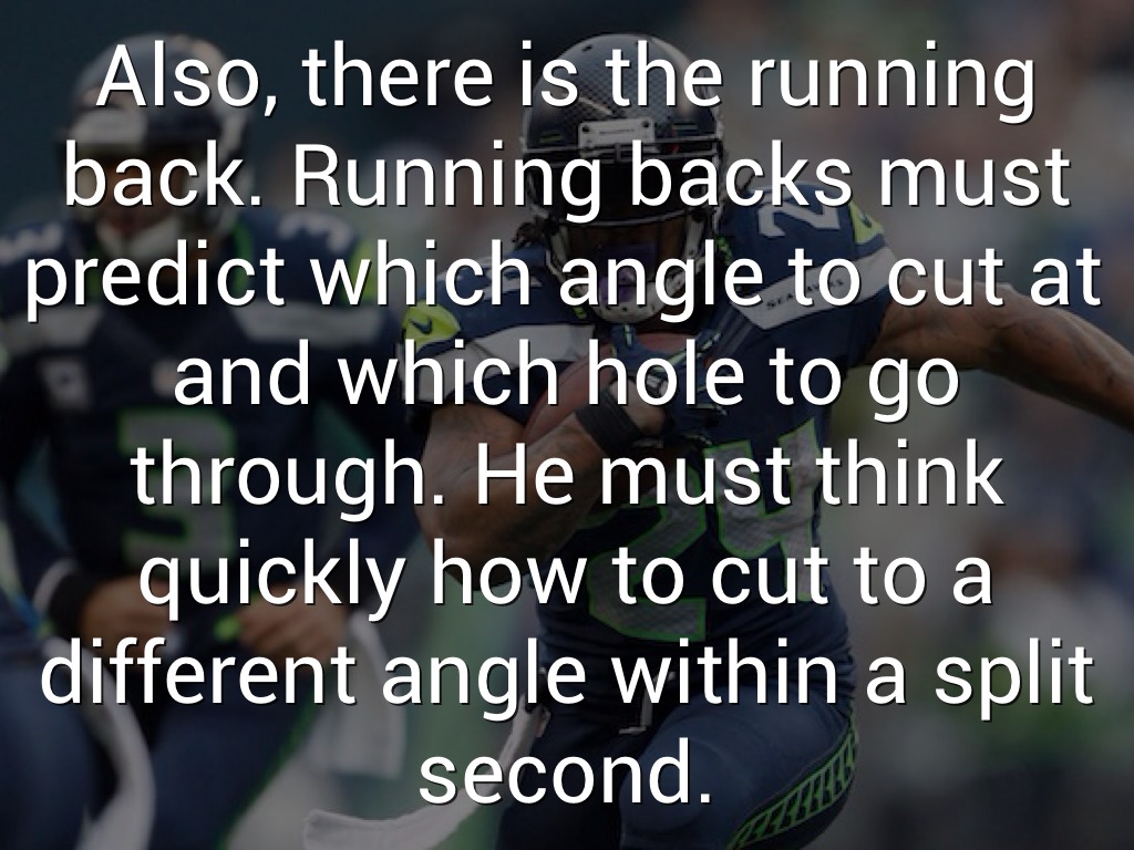 Also, there is the running back. Running backs must predict which angle to cut at and which hole to go through. He must think quickly how to cut to a different angle within a split second.