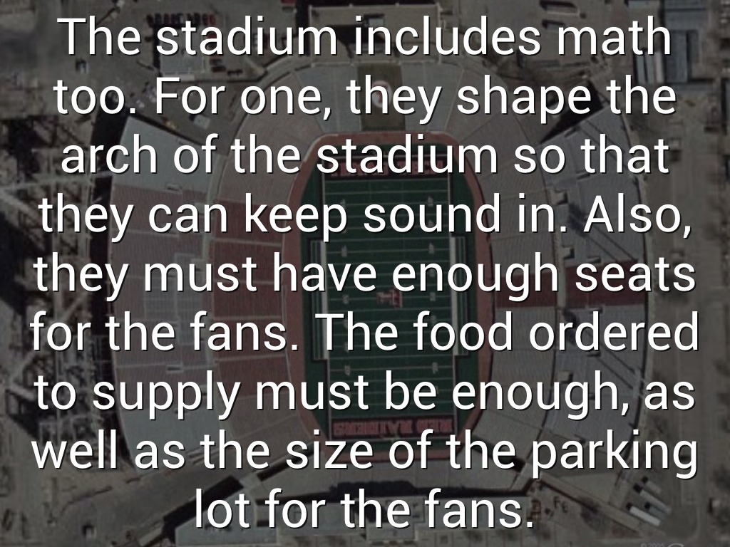 The stadium includes math too. For one, they shape the arch of the stadium so that they can keep sound in. Also, they must have enough seats for the fans. The food ordered to supply must be enough, as well as the size of the parking lot for the fans.