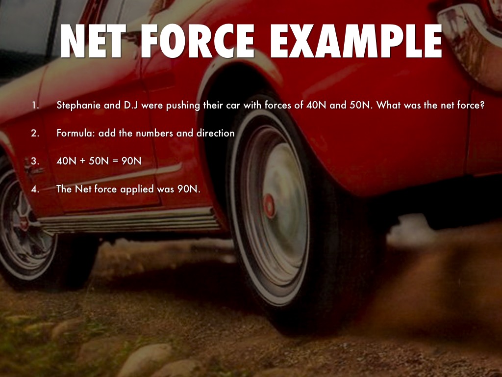 Stephanie and D.J were pushing their car with forces of 40N and 50N. What was the net force?