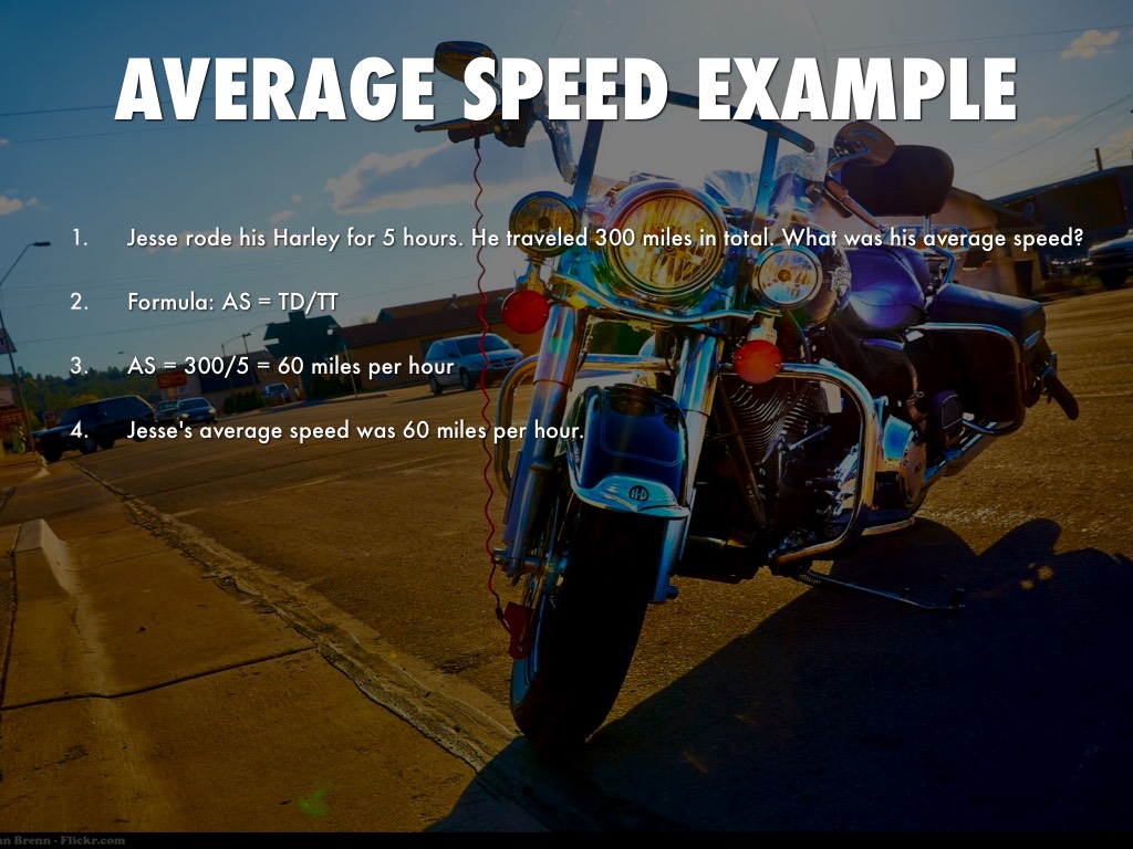 Jesse rode his Harley for 5 hours. He traveled 300 miles in total. What was his average speed?