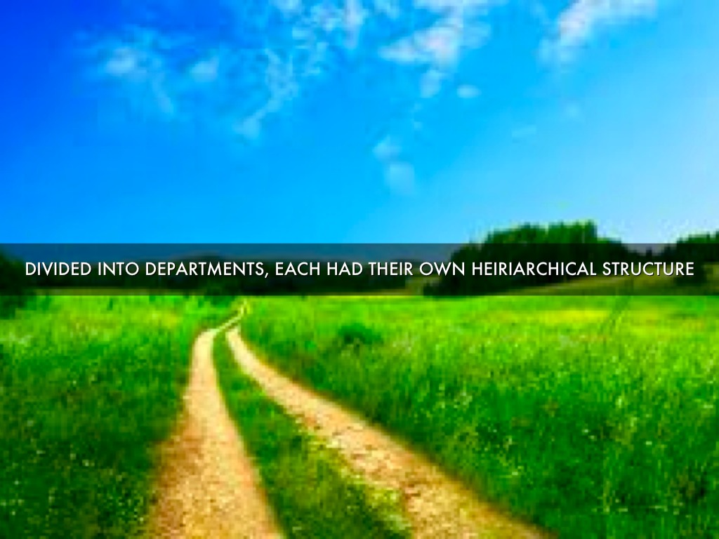 DIVIDED INTO DEPARTMENTS, EACH HAD THEIR OWN HEIRIARCHICAL STRUCTURE