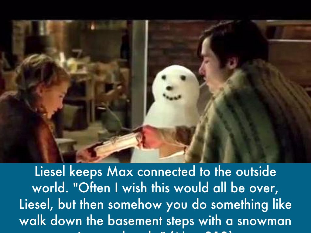 Liesel keeps Max connected to the outside world. "Often I wish this would all be over, Liesel, but then somehow you do something like walk down the basement steps with a snowman in your hands." (Max 313)