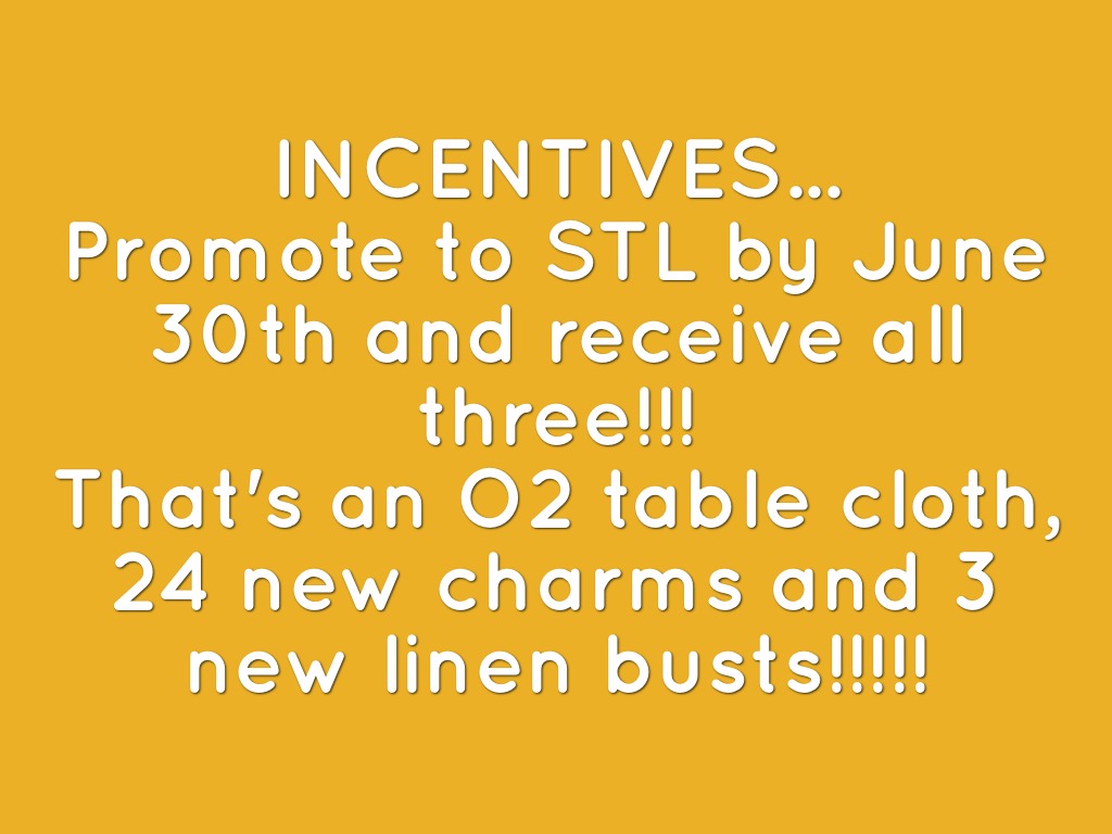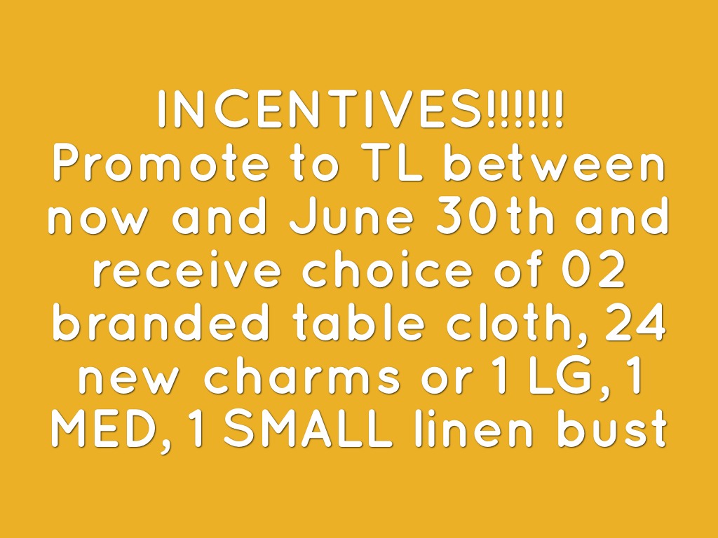 Promote to TL between now and June 30th and receive choice of 02 branded table cloth, 24 new charms or 1 LG, 1 MED, 1 SMALL linen bust