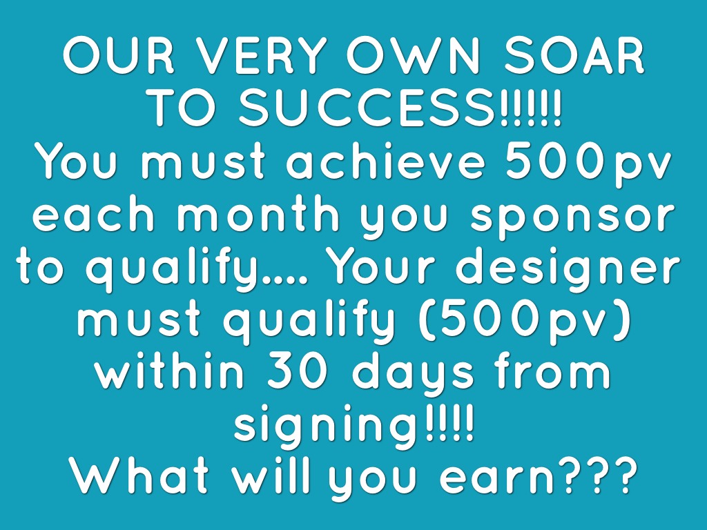 You must achieve 500pv each month you sponsor to qualify.... Your designer must qualify (500pv) within 30 days from signing!!!!