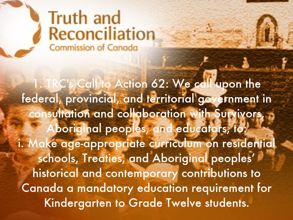 1. TRC's Call to Action 62: We call upon the federal, provincial, and territorial government in consultation and collaboration with Survivors, Aboriginal peoples, and educators, to: