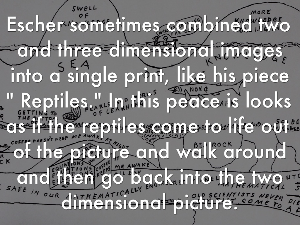 Escher sometimes combined two and three dimensional images into a single print, like his piece " Reptiles." In this peace is looks as if the reptiles come to life out of the picture and walk around and then go back into the two dimensional picture.