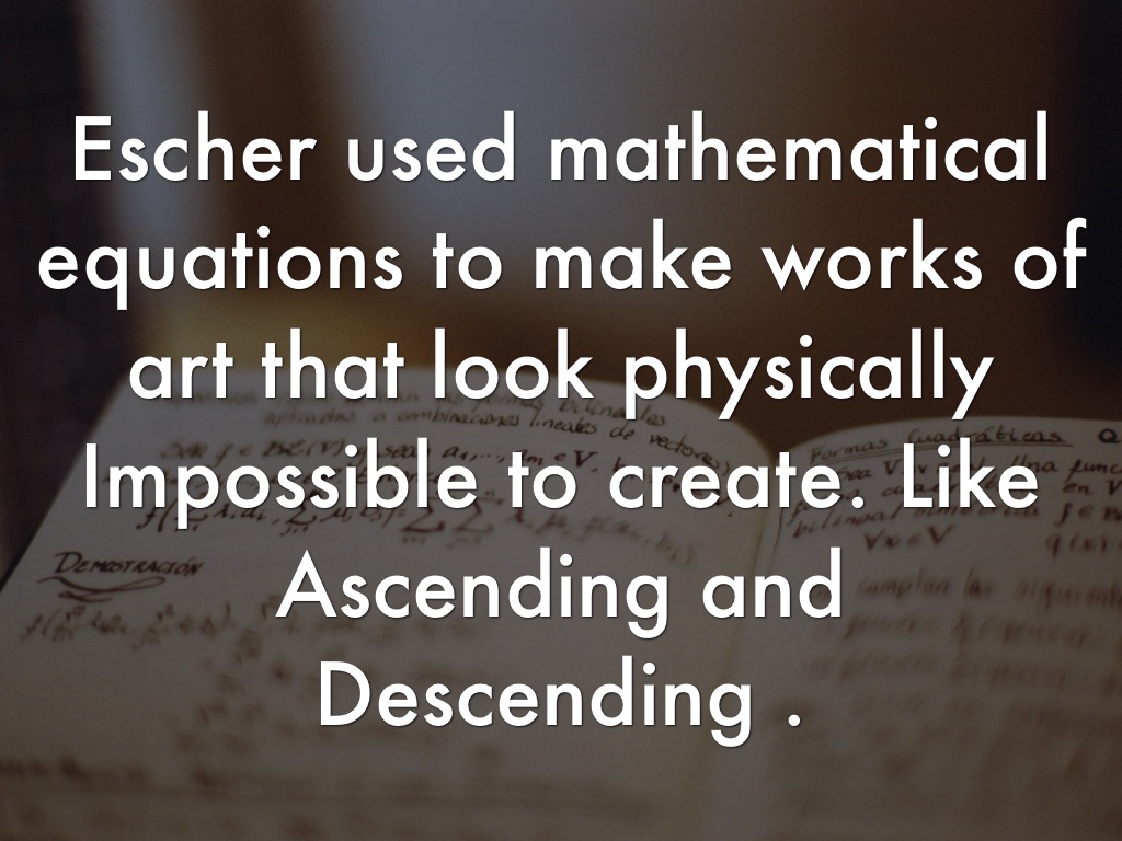 Escher used mathematical equations to make works of art that look physically Impossible to create. Like Ascending and Descending .