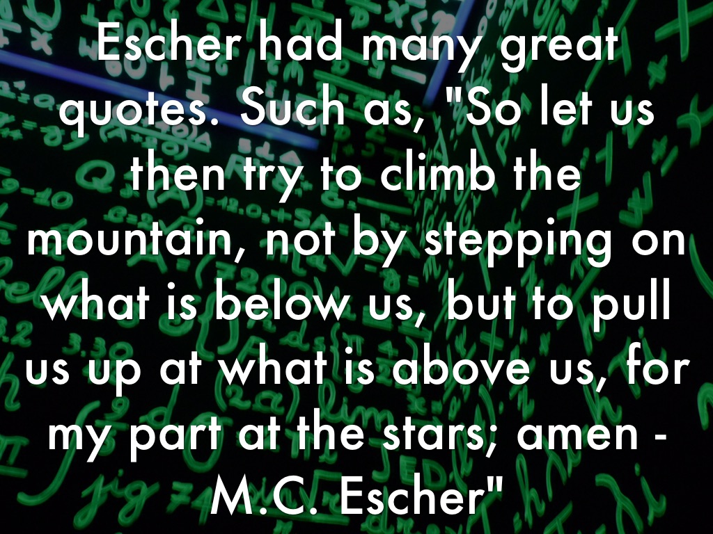 Escher had many great quotes. Such as, "So let us then try to climb the mountain, not by stepping on what is below us, but to pull us up at what is above us, for my part at the stars; amen - M.C. Escher"
