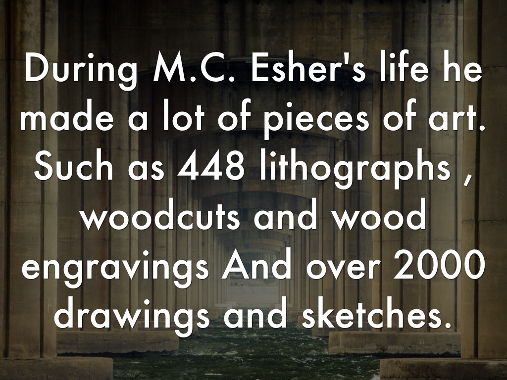 During M.C. Esher's life he made a lot of pieces of art. Such as 448 lithographs , woodcuts and wood engravings And over 2000 drawings and sketches.