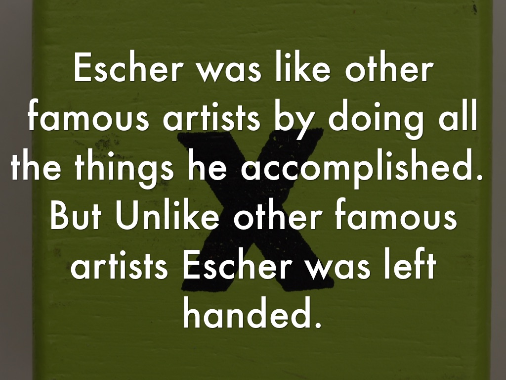 Escher was like other famous artists by doing all the things he accomplished. But Unlike other famous artists Escher was left handed.
