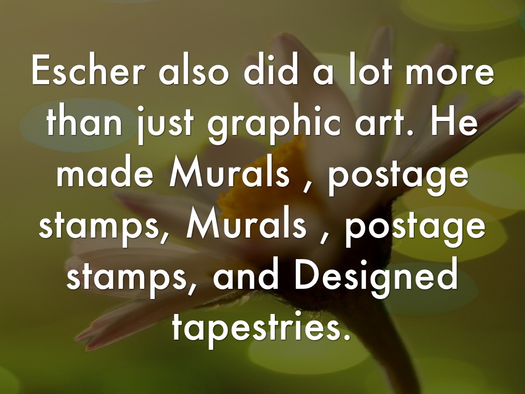 Escher also did a lot more than just graphic art. He made Murals , postage stamps, Murals , postage stamps, and Designed tapestries.