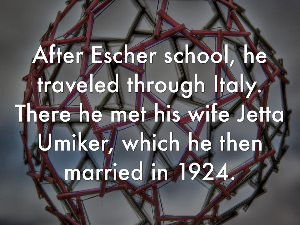 After Escher school, he traveled through Italy. There he met his wife Jetta Umiker, which he then married in 1924.