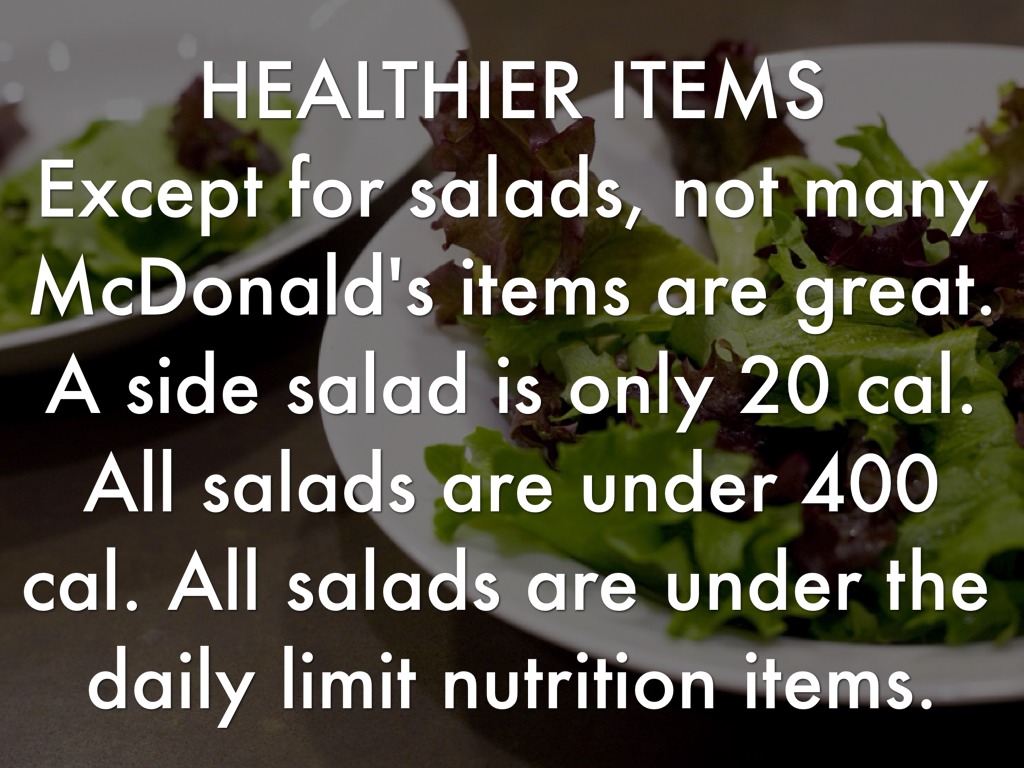 A side salad is only 20 cal. All salads are under 400 cal. All salads are under the daily limit nutrition items.