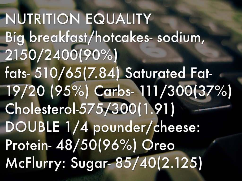 DOUBLE 1/4 pounder/cheese: Protein- 48/50(96%) Oreo McFlurry: Sugar- 85/40(2.125)