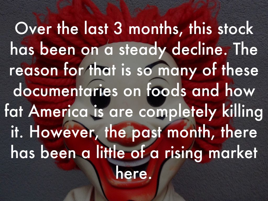 Over the last 3 months, this stock has been on a steady decline. The reason for that is so many of these documentaries on foods and how fat America is are completely killing it. However, the past month, there has been a little of a rising market here.