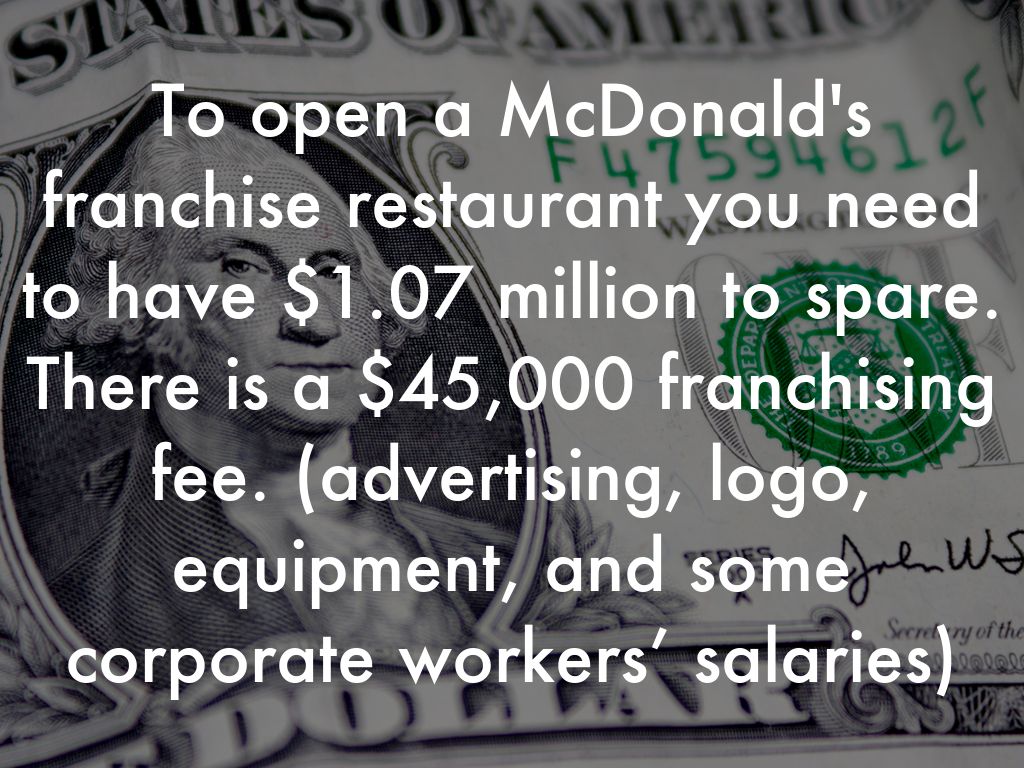 To open a McDonald's franchise restaurant you need to have $1.07 million to spare. There is a $45,000 franchising fee. (advertising, logo, equipment, and some corporate workers’ salaries)