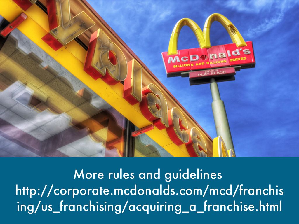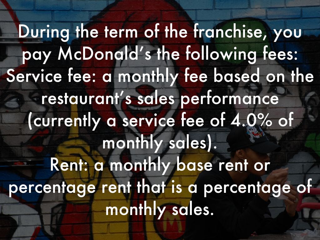 During the term of the franchise, you pay McDonald’s the following fees: Service fee: a monthly fee based on the restaurant’s sales performance (currently a service fee of 4.0% of monthly sales). Rent: a monthly base rent or percentage rent that is a percentage of monthly sales.