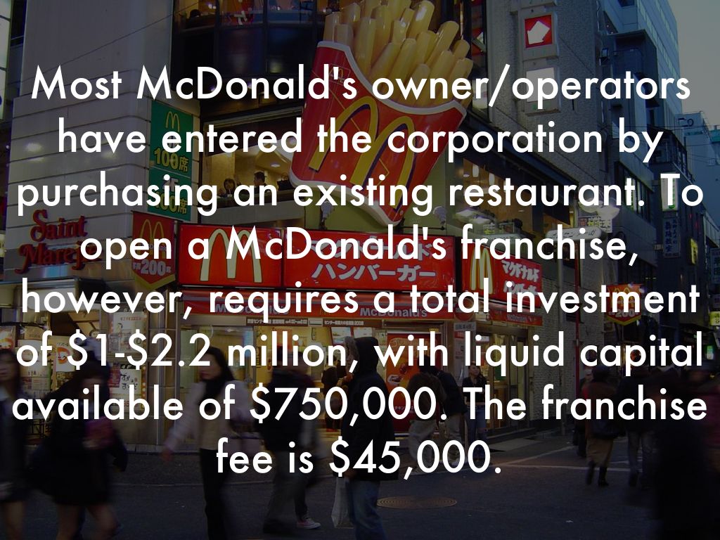 Most McDonald's owner/operators have entered the corporation by purchasing an existing restaurant. To open a McDonald's franchise, however, requires a total investment of $1-$2.2 million, with liquid capital available of $750,000. The franchise fee is $45,000.
