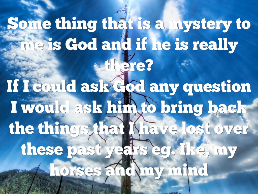 Some thing that is a mystery to me is God and if he is really there? If I could ask God any question I would ask him to bring back the things that I have lost over these past years eg. Ike, my horses and my mind