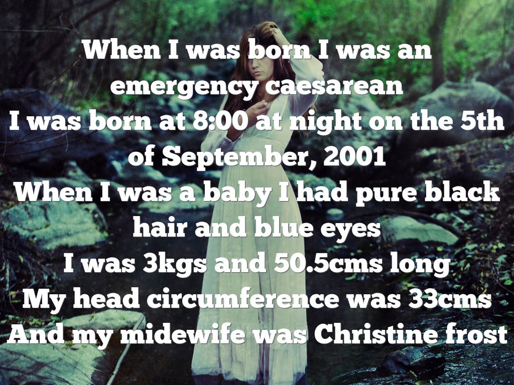 When I was born I was an emergency caesarean I was born at 8:00 at night on the 5th of September, 2001 When I was a baby I had pure black hair and blue eyes I was 3kgs and 50.5cms long My head circumference was 33cms And my midewife was Christine frost