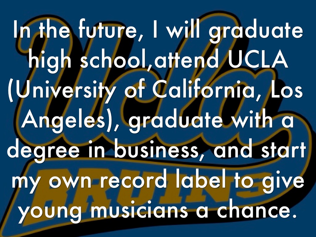 In the future, I will graduate high school,attend UCLA (University of California, Los Angeles), graduate with a degree in business, and start my own record label to give young musicians a chance.