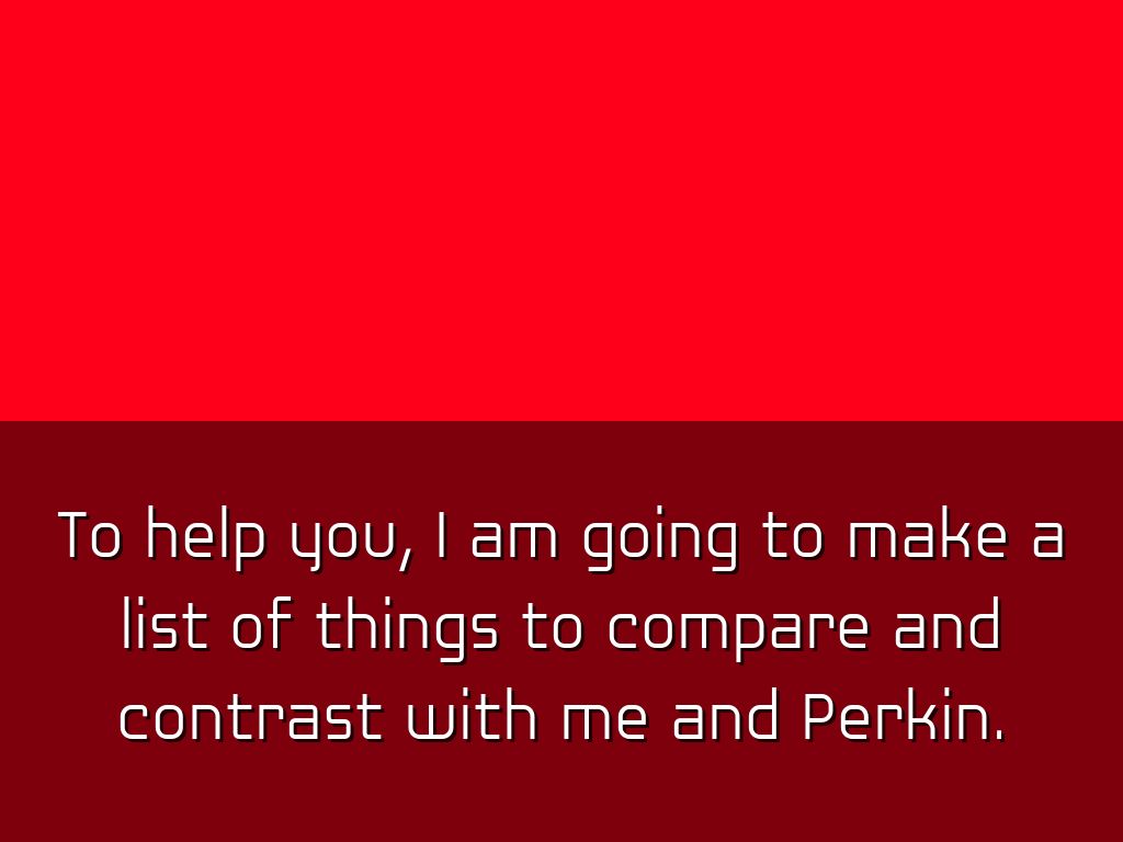 To help you, I am going to make a list of things to compare and contrast with me and Perkin.