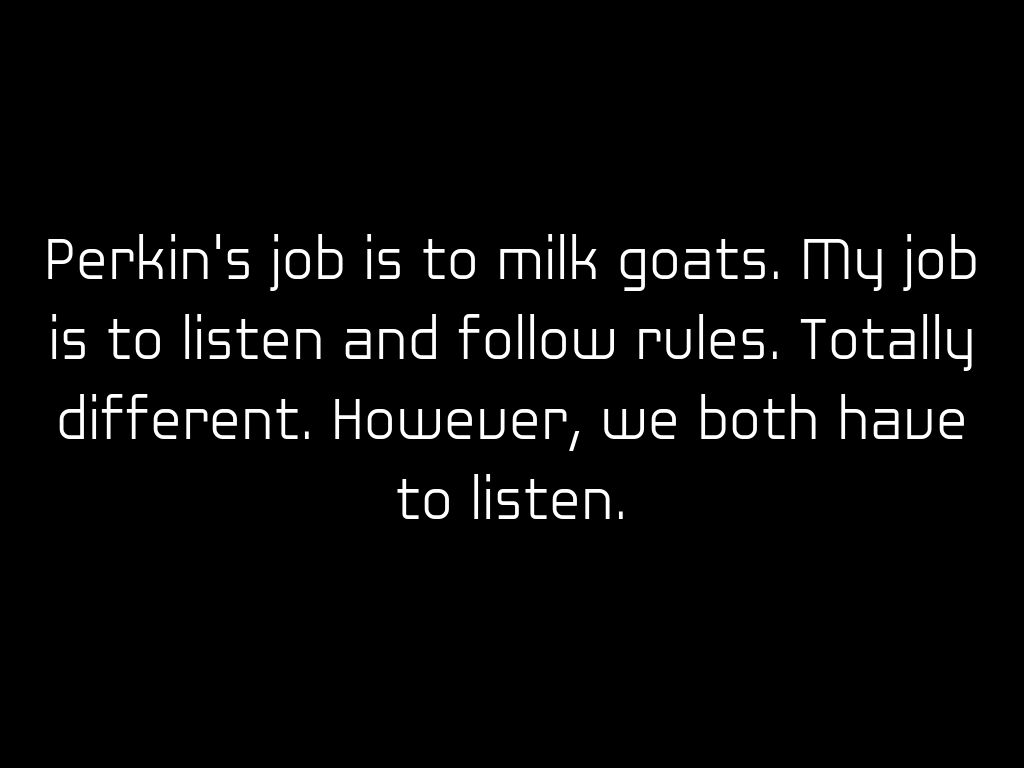 Perkin's job is to milk goats. My job is to listen and follow rules. Totally different. However, we both have to listen.