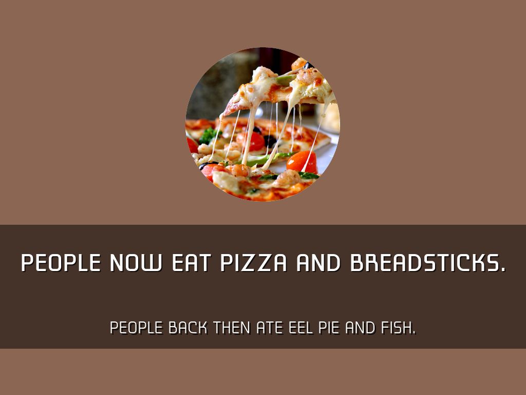 PEOPLE NOW EAT PIZZA AND BREADSTICKS.