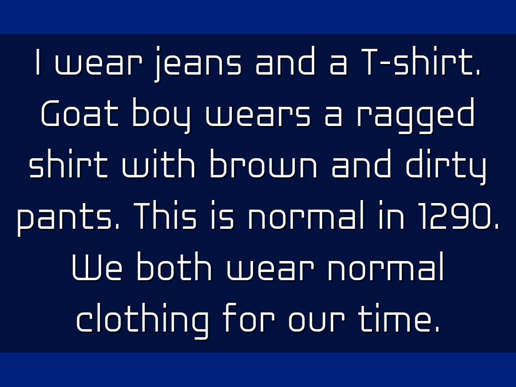 I wear jeans and a T-shirt. Goat boy wears a ragged shirt with brown and dirty pants. This is normal in 1290. We both wear normal clothing for our time.